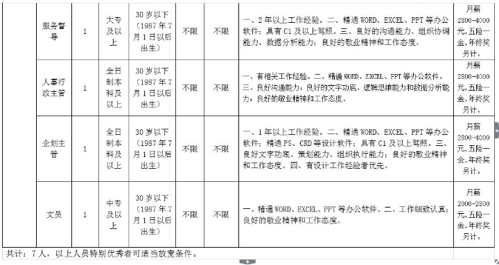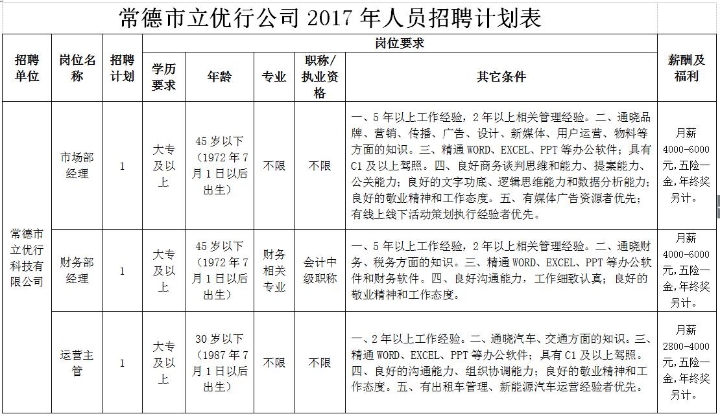 常德市立优行科技有限公司由常德市交通建设投资集团有限公司(常德市属国有独资中I型企业)与浙江吉利控股集团有限公司(世界500强企业)共同出资成立,旨在发展成为常德市“互联网+新能源汽车共享出行第一平台”。公司将主要开展新能源网约车、分时租赁、快运、同城O2O移动电商(低碳精品生活购物)、碳银行等业务,拟于2018年正式运营。 因工作需要,拟面向社会公开招聘一批工作人员,现将有关事项公告如下: 一、招聘岗位及人数 本次计划招聘7人:市场部经理1人、财务部经理1人、运营主管1人、服务督导1人、企划主管1人、人事行政主管1人、文员1人,具体条件见附件。 二、招聘程序 (一)报名 1.发布信息:通过常德市交通运输局网站、市交建投网站、立行公司网站、湘西北人力资源市场网站等渠道,发布招聘信息。时间为2017年12月8日至12月14日下午17:30止。 2.公开报名及资格审查。所有应聘人员通过电子邮件投递简历报名,邮箱地址为:lijin@hnlxti.com,每个应聘者限报1个岗位,报名截止时间为2017年12月14日17:30。资格审查通过后进行现场资格审核,审核时间为2017年12月14日-15日。 资格审查时应携带:1.本人有效身份证、学历、学位、专业技术职务、职(执)业资格证书、获奖证书等原件和复印件;2.近期同底1寸彩色证件照3张;3.证明其工作经历的劳动合同原件、工作证明原件或社保缴费单。报名资料:身份证、学历、学位、专业技术职务、职业资格证书、获奖证书等原件,待资格审查后,退回本人,其他资料和复印件恕不退还。报名时须如实填写《应聘人员登记表》。资格审查贯穿整个招聘过程,在任何一个环节如发现报考人员弄虚作假或不符合报考条件的,随时取消其考试、聘用资格。 (二)确定开考岗位数 按照岗位招聘计划与报考人数不低于1:2的比例确定。 (三)准考证领取 报名者凭身份证领取准考证,时间2017年12月16日上午9:00至下午5:00。地点设立行公司一楼培训中心办公室,逾期未领取视为自动放弃。 (四)考试 考试包括笔试和面试。 1.笔试。笔试总分100分。具体时间和地点详见准考证说明。 2.面试。面试总分100分。具体时间和地点另行通知。财务部经理一职需经杭州优行科技有限公司面试确定后方可进行下一步程序。 (五)成绩合成 总成绩=笔试成绩×50%+面试成绩×50%。所有成绩均按四舍五入保留到小数点后两位数字。 (六)体检 按照招考计划1:1比例按总成绩从高分到低分的顺序且总分在75分以上的人选确定体检对象。体检参照公务员录用标准和办法执行。不按规定进行体检的,视为放弃。报考人员在体检过程中弄虚作假或故意隐瞒真实情况的,按有关规定处理。 (七)考核 对体检合格者的思想政治表现、道德品质、业务能力、工作实绩等情况进行考核,并进行资格复查。 如有体检或考核不合格者,可按总成绩从高分到低分依次递补,递补不超过一次。如无递补人员或递补人员分数过低,则该岗位空缺。 根据考试、体检和考核结果,确定拟聘用人选名单,并相应网站进行公示,公示期为5个工作日。 (十)聘用手续办理 由立优行公司与被聘用人员签订劳动合同,办理相关聘用手续。 三、组织与监督 1.整个招聘工作全程公开,市交建投集团纪委全程监督,确保公开、公平、公正。 2.整个招聘工作遵守公开制度、回避制度、保密制度和申报核准制度。 监督电话:0736-7781183(市交建投集团公司纪委) 本次招聘公告的最终解释权归常德市立优行公司所有。 联系电话:0736-2912228 附: 常德市立优行公司2017年人员招聘计划表