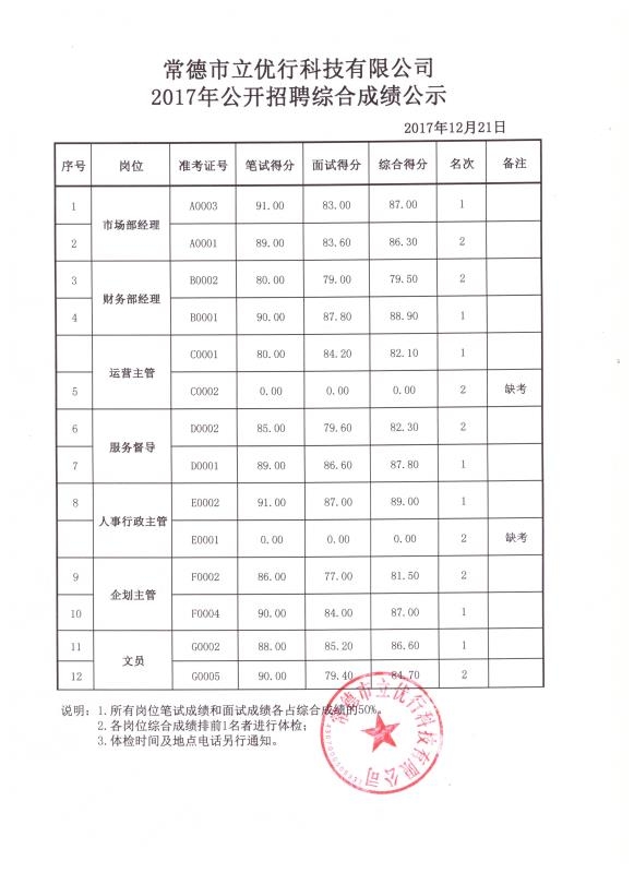【公示】2017年立优行公司公开招聘综合成绩公示